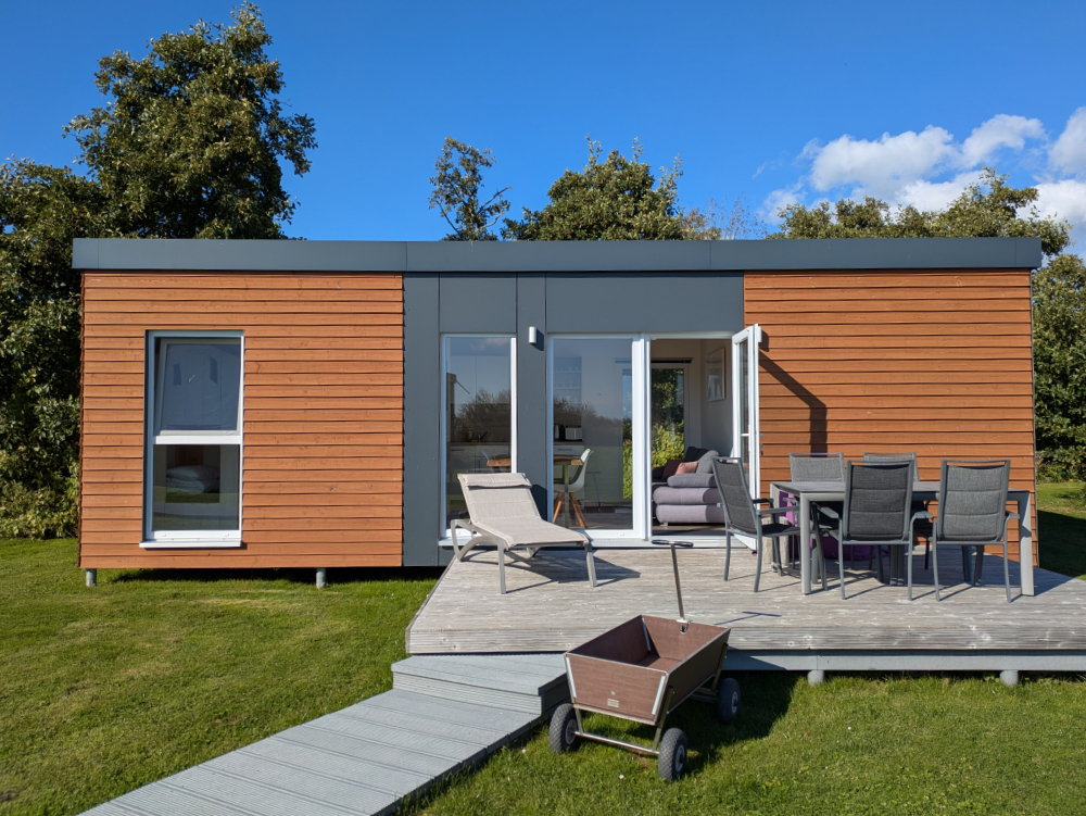 liebevoll gestaltetes, lichtdurchflutetes Campinghaus mit eigenem Bad und Blick ins Grüne |